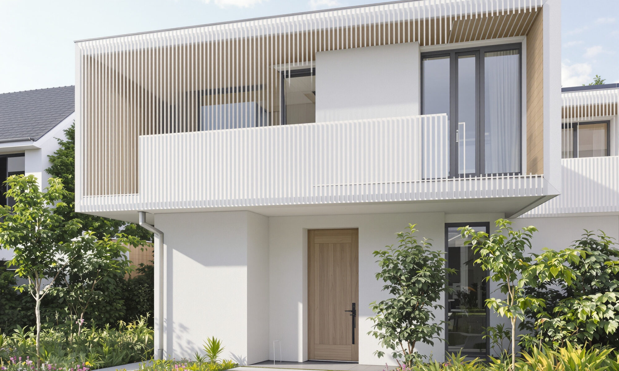 • Prolongements extérieurs : Terrasses, balcons et jardins sont conçus comme des extensions naturelles de l’espace intérieur, agrandissant visuellement et fonctionnellement la maison.